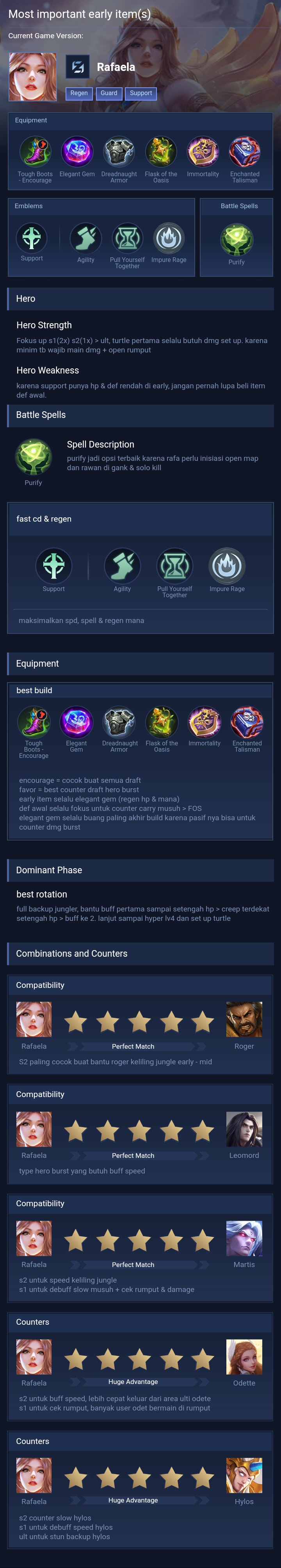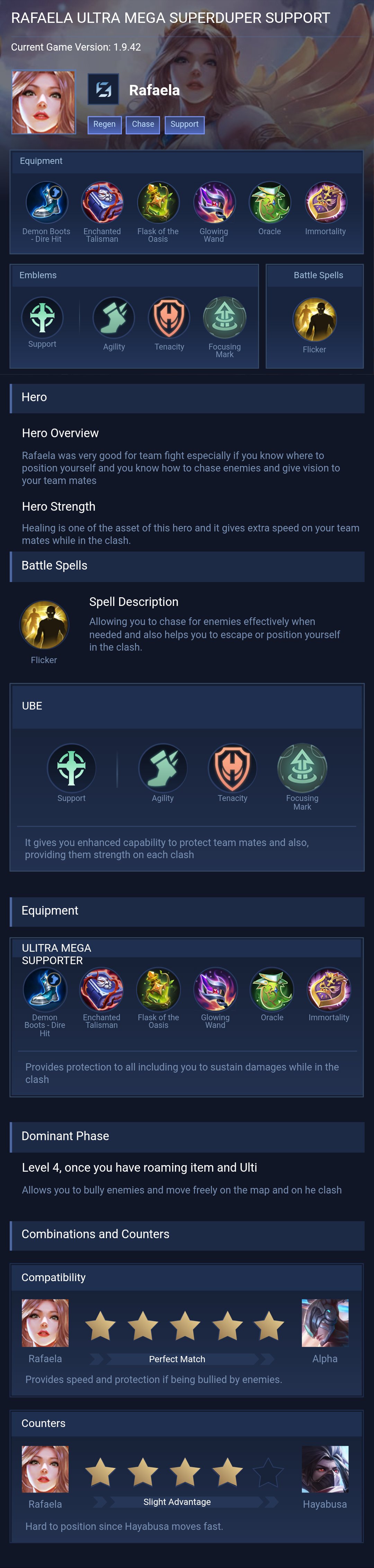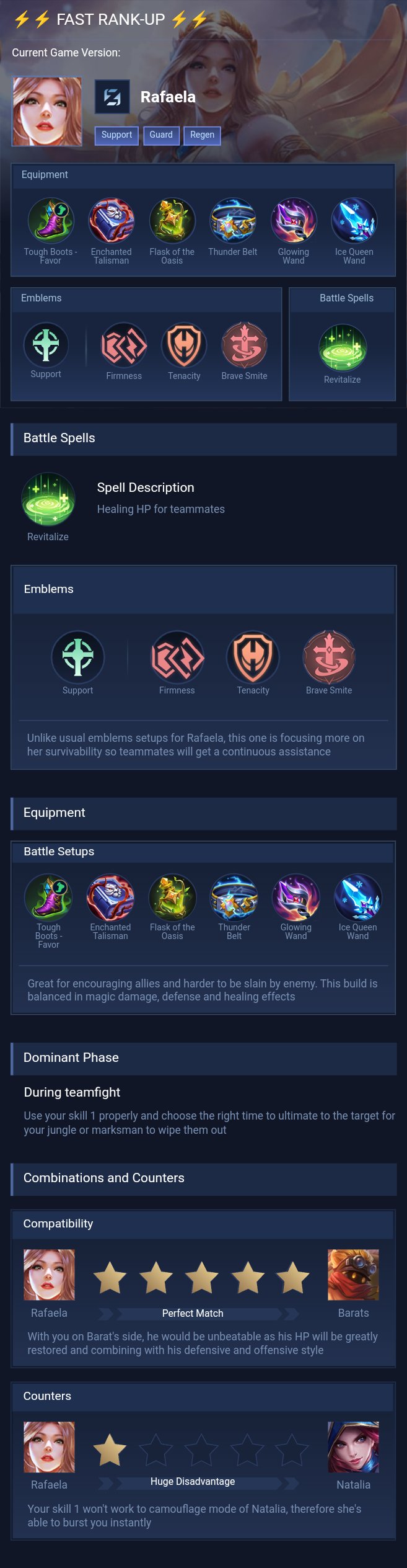 Rafaela is a support hero with easy difficulty. This is a live guide — win rate, pick rate and counter data refresh every 6 hours from real ranked matches.