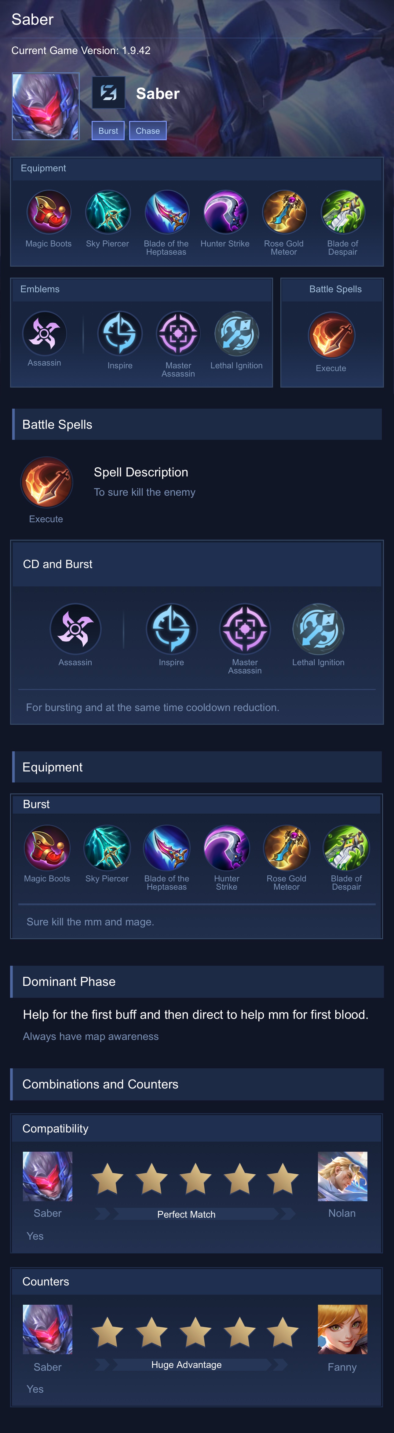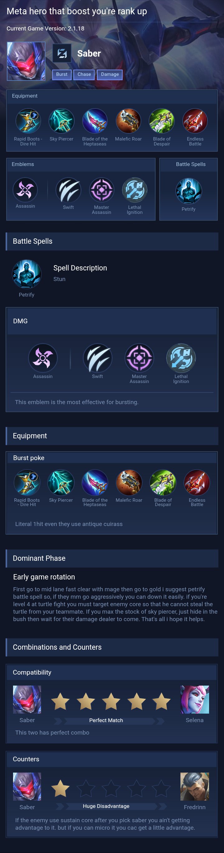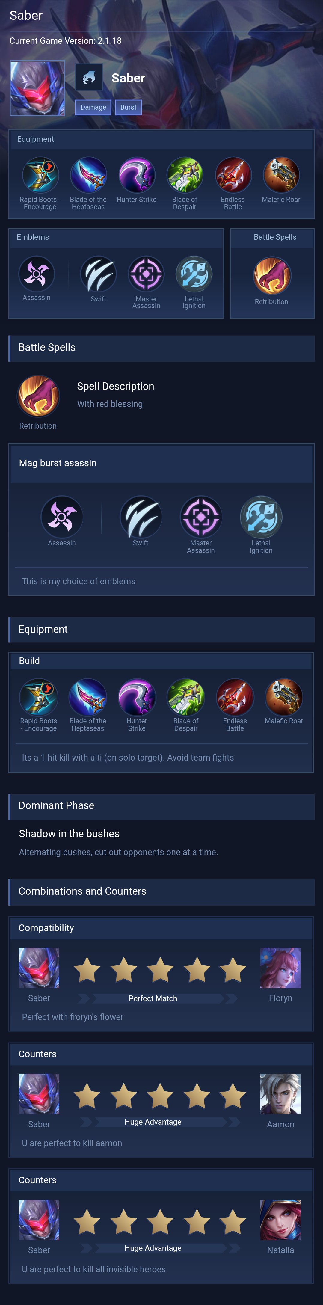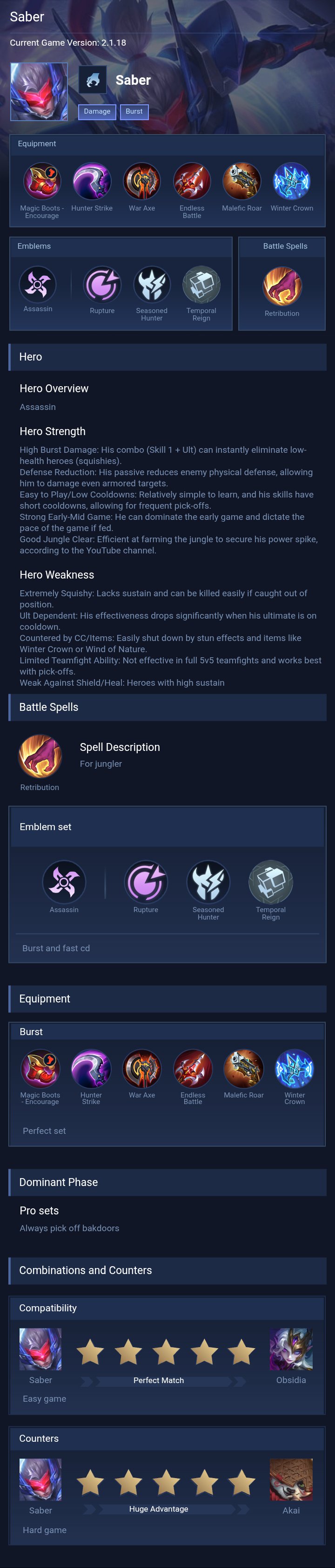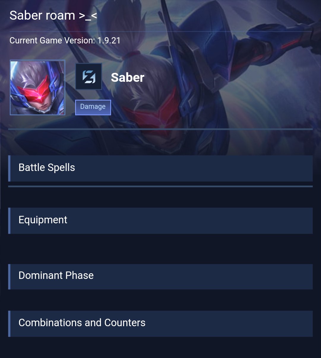 Saber is a assassin hero with easy difficulty. This is a live guide — win rate, pick rate and counter data refresh every 6 hours from real ranked matches.