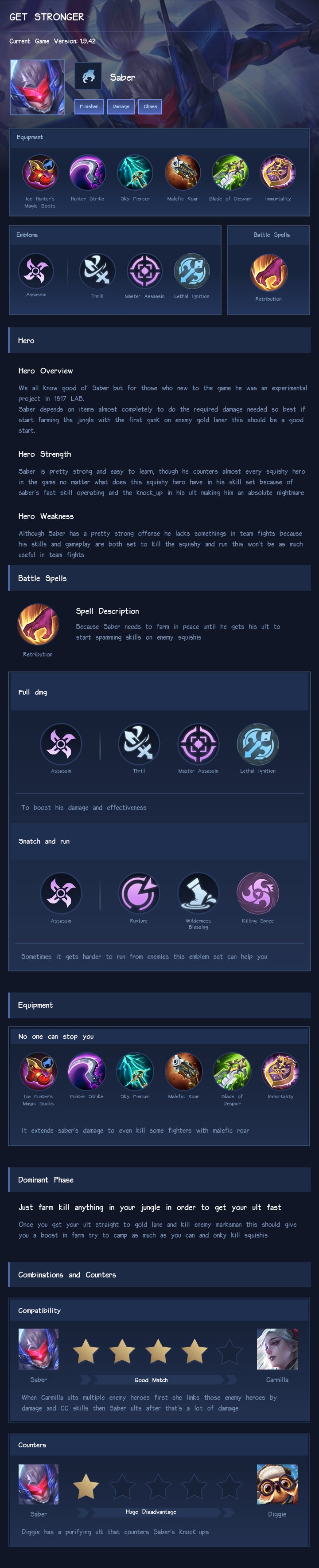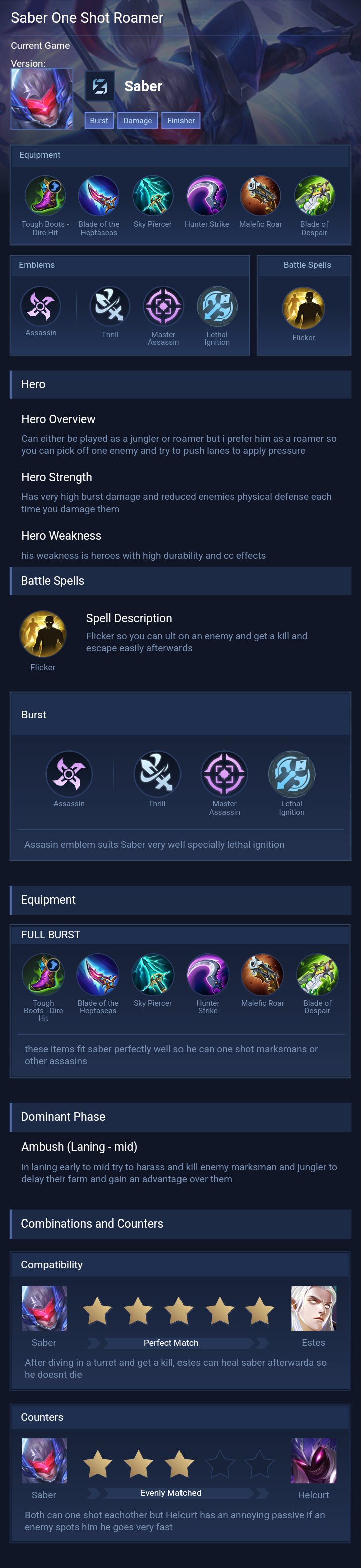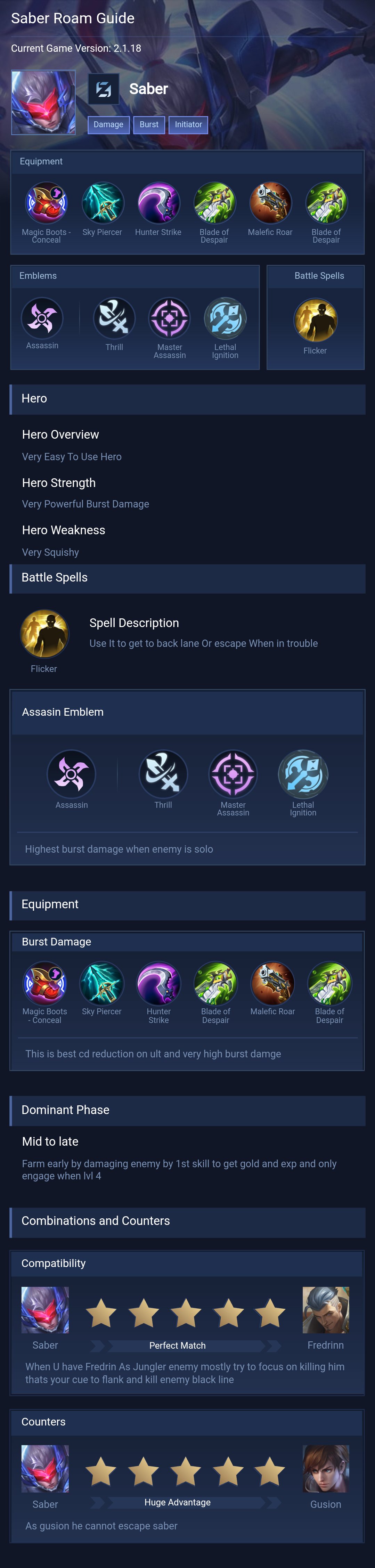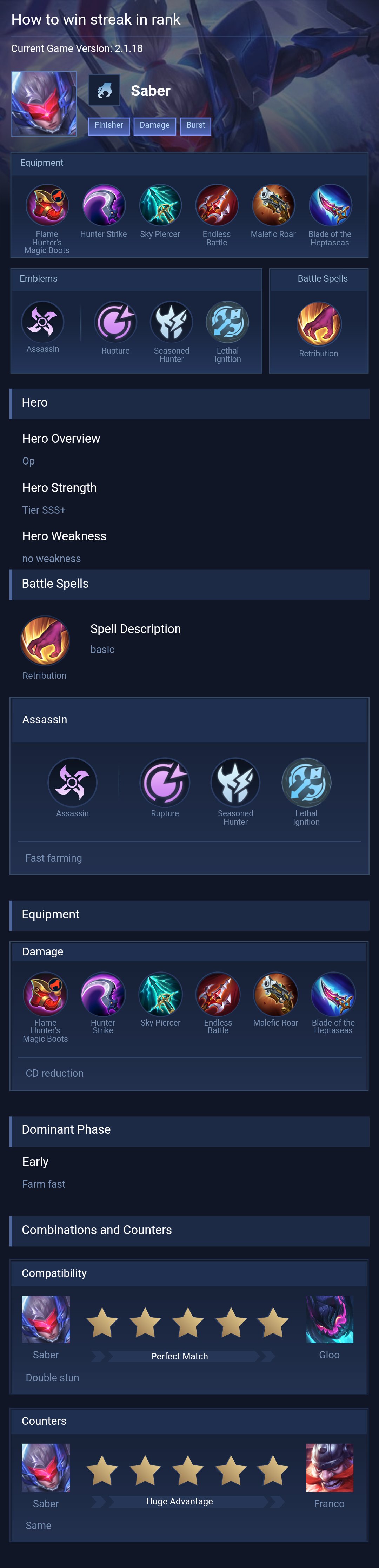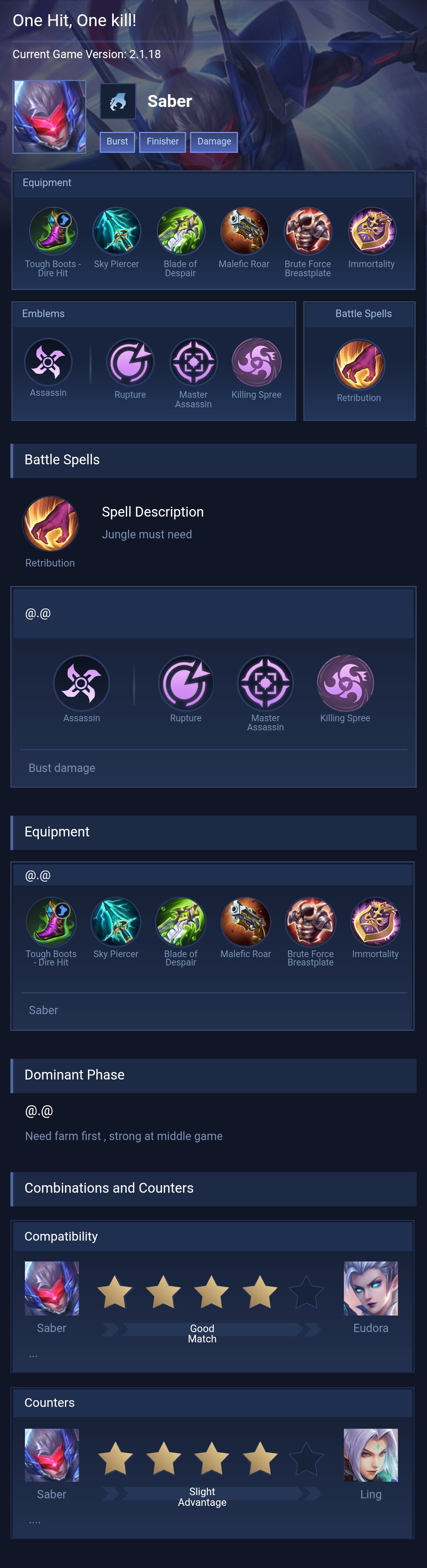 Saber is a assassin hero with easy difficulty. This is a live guide — win rate, pick rate and counter data refresh every 6 hours from real ranked matches.