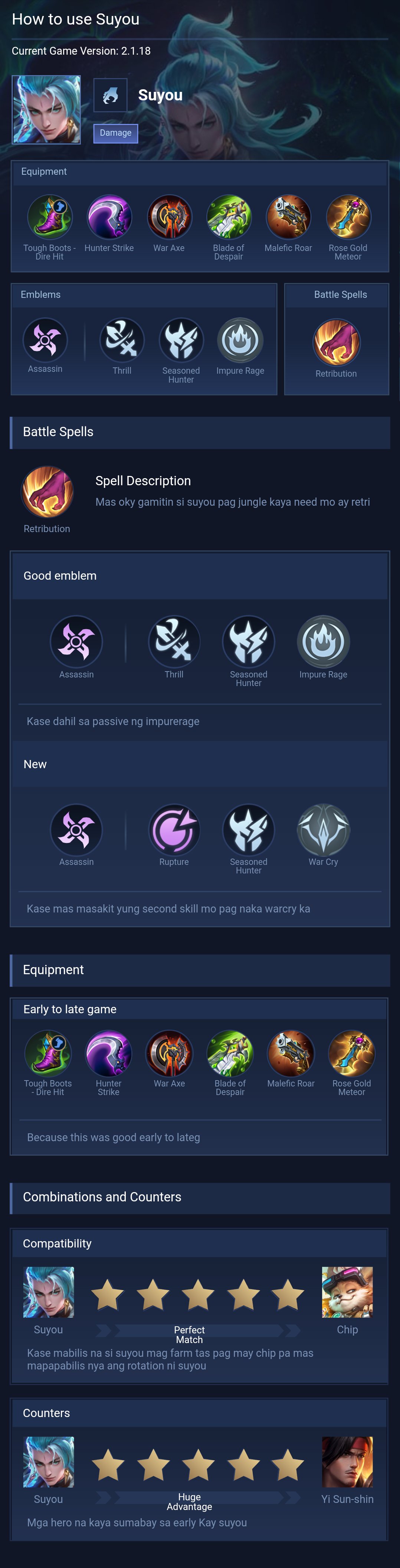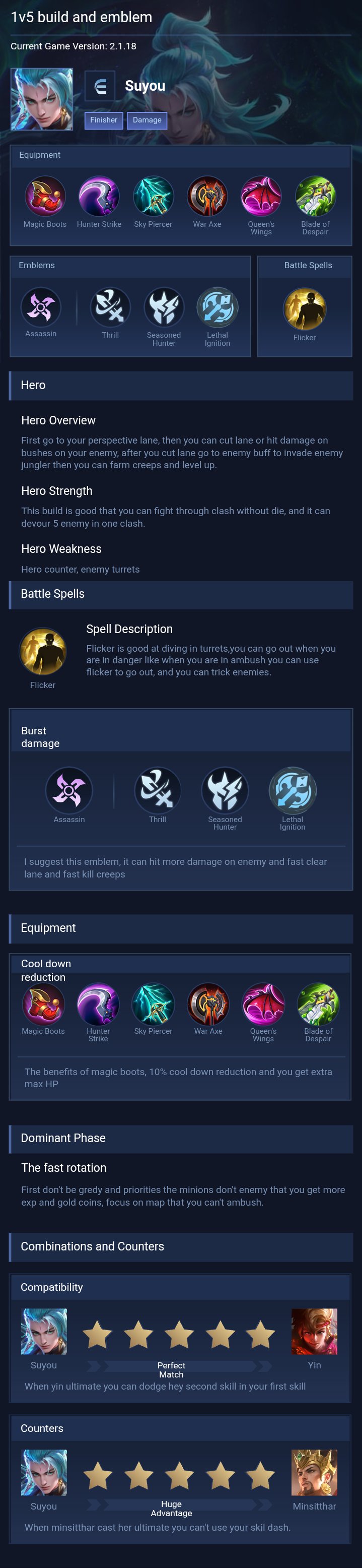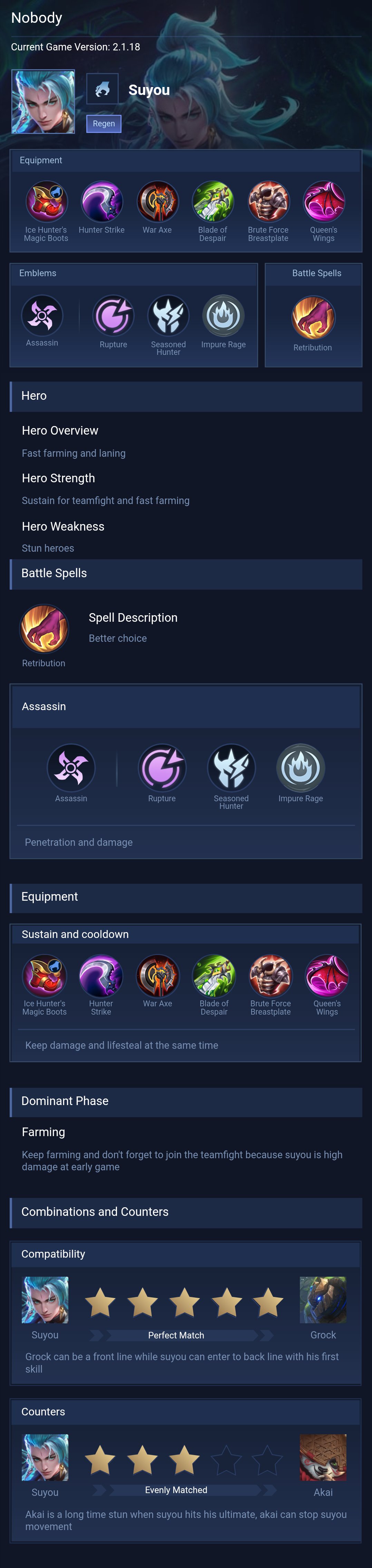 Suyou is a assassin hero with hard difficulty. This is a live guide — win rate, pick rate and counter data refresh every 6 hours from real ranked matches.