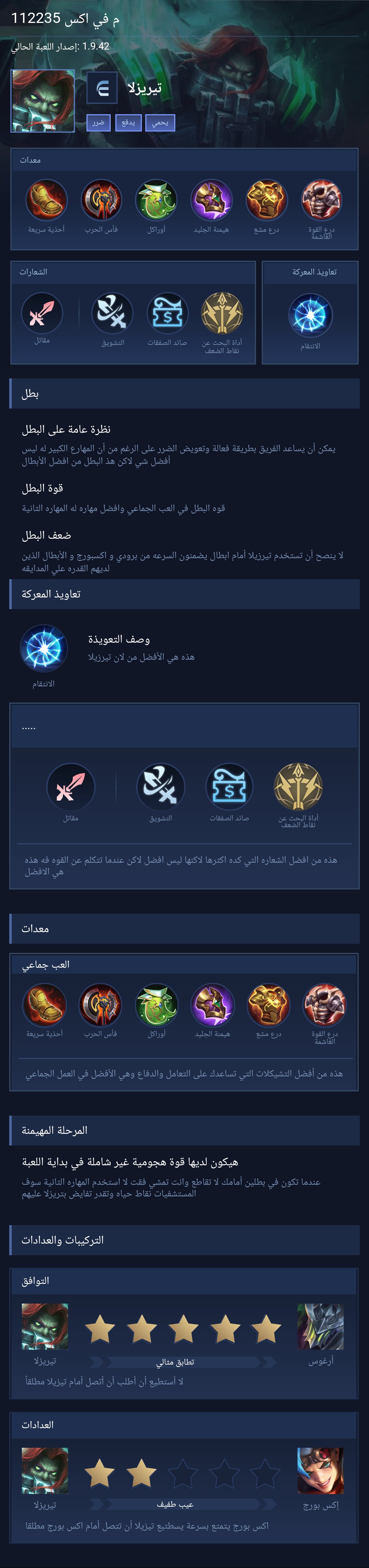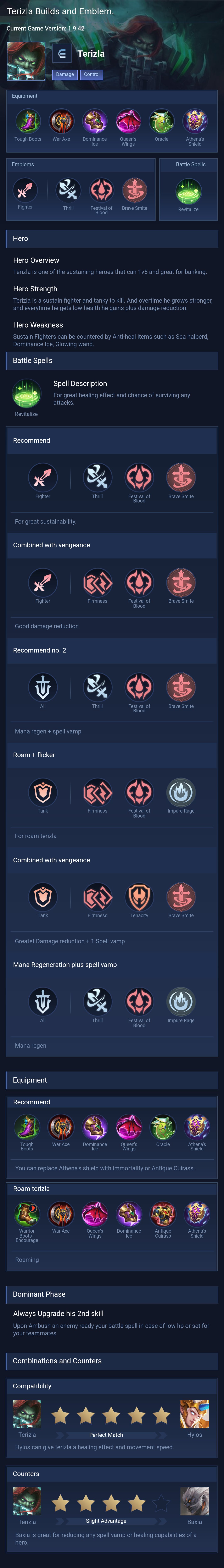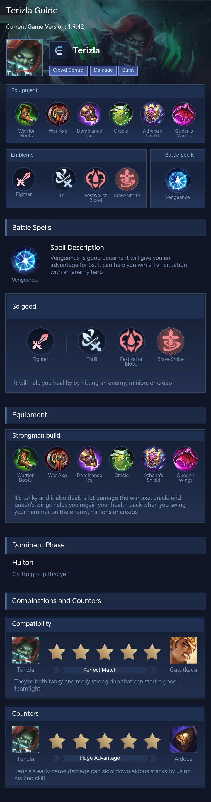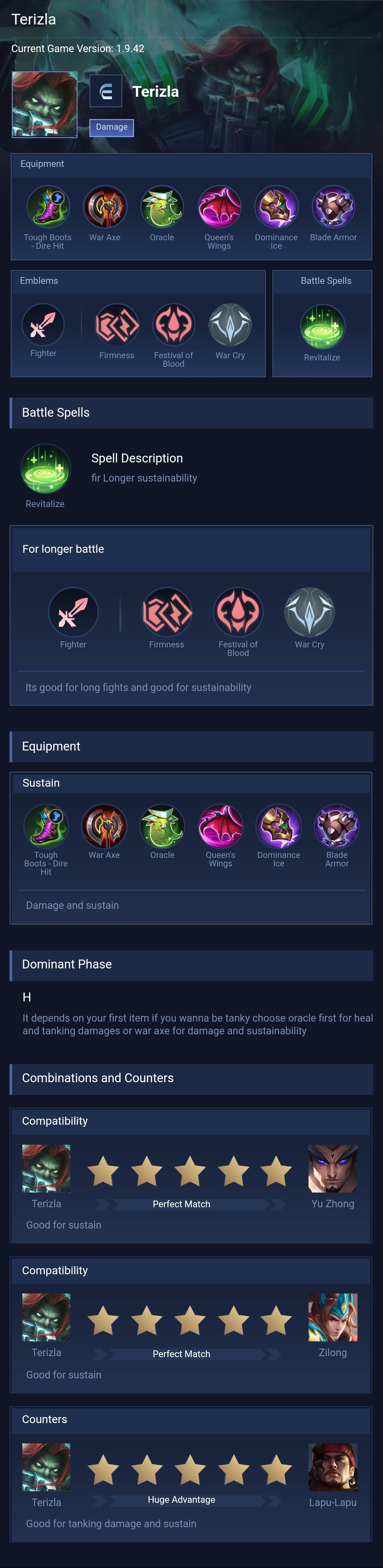 Terizla is a fighter hero with easy difficulty. This is a live guide — win rate, pick rate and counter data refresh every 6 hours from real ranked matches.