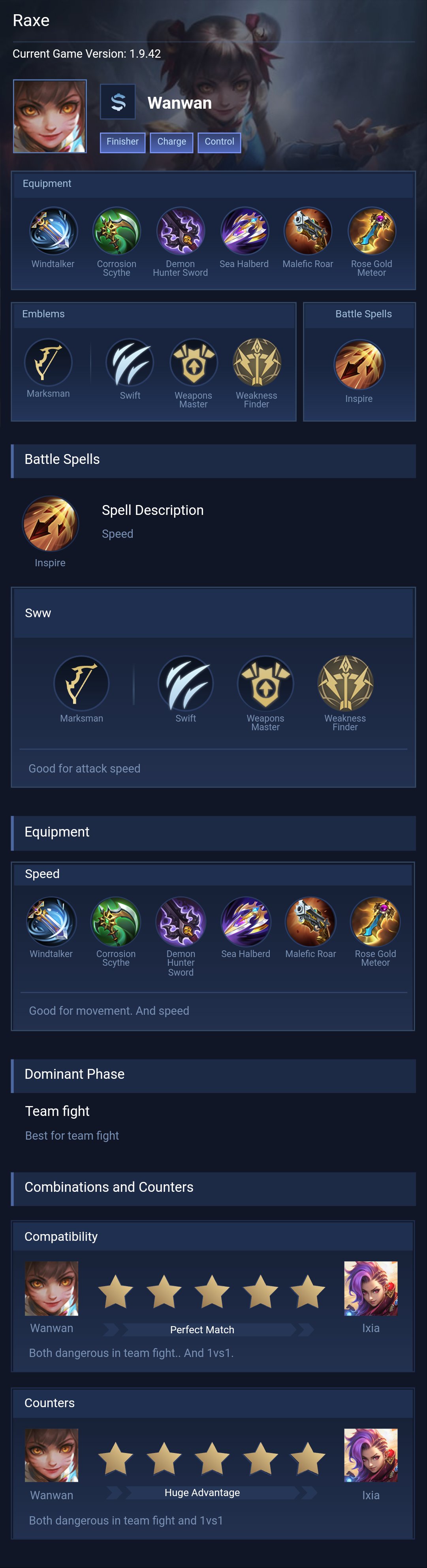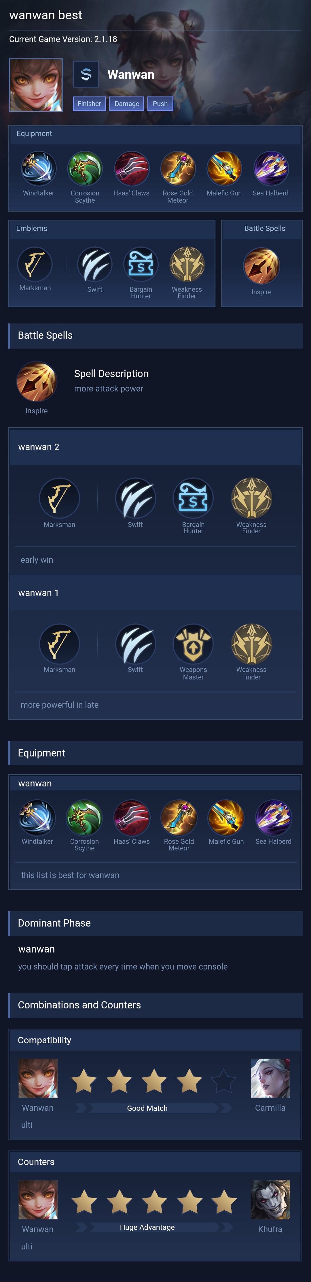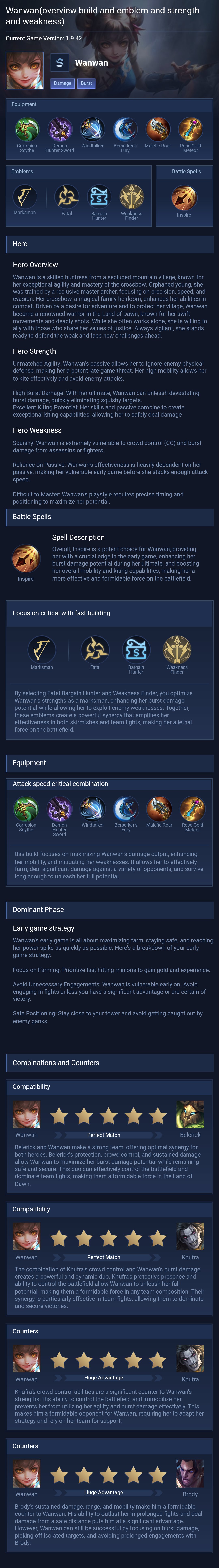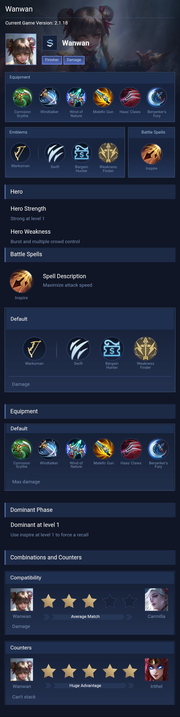 Wanwan is a marksman hero with medium difficulty. This is a live guide — win rate, pick rate and counter data refresh every 6 hours from real ranked matches.