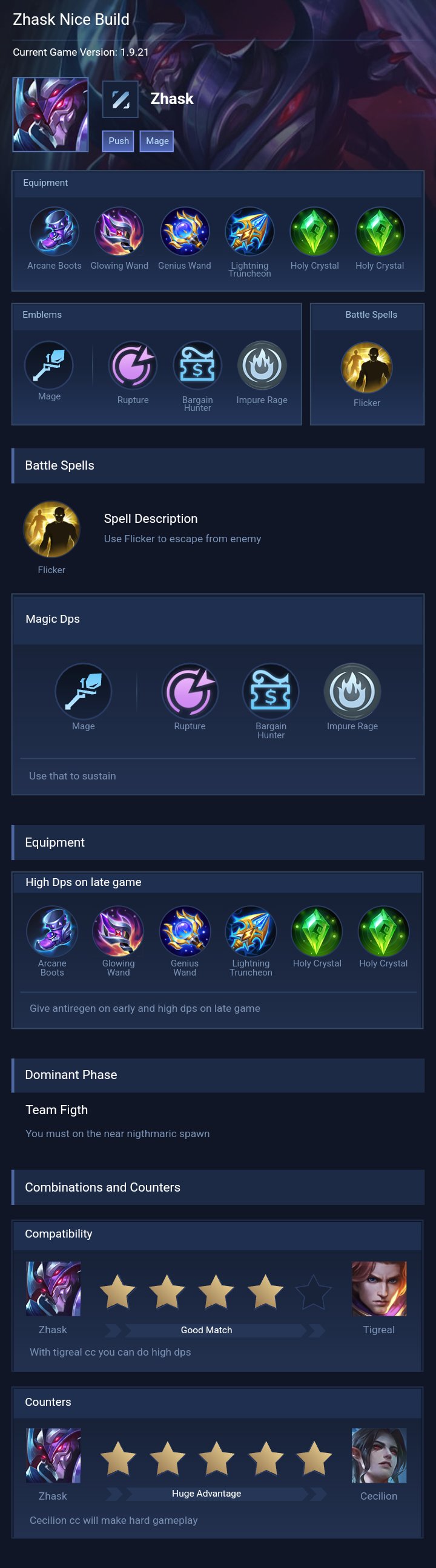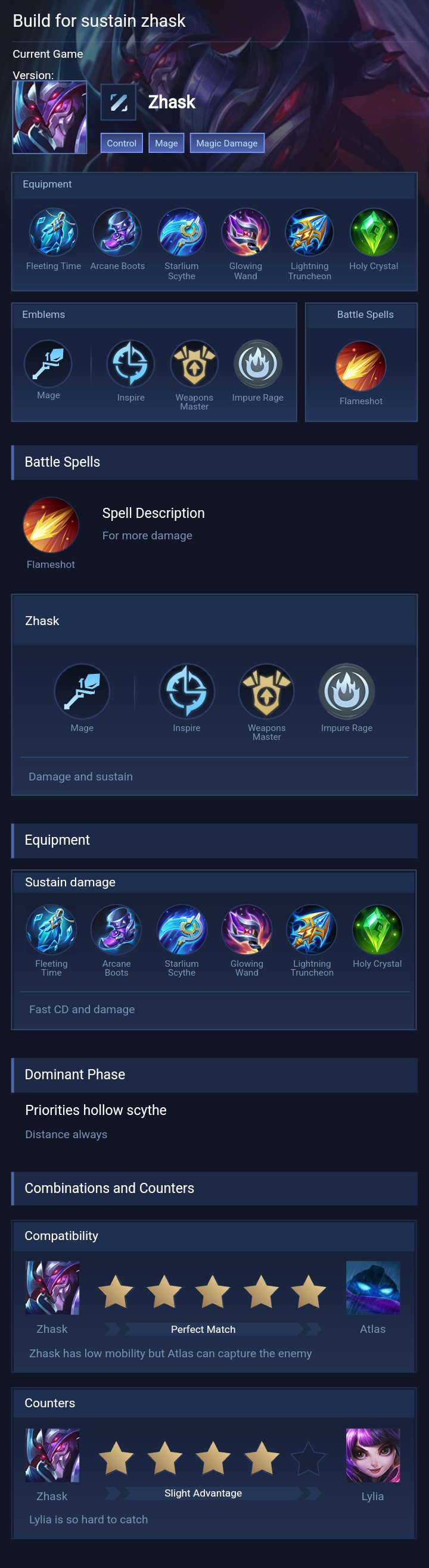 Late Game Core. Going to the late game, purchase Holy Crystal and Starlium Scythe. The Holy Crystal is key for significantly boosting Zhasks magic power, making your skills more lethal.