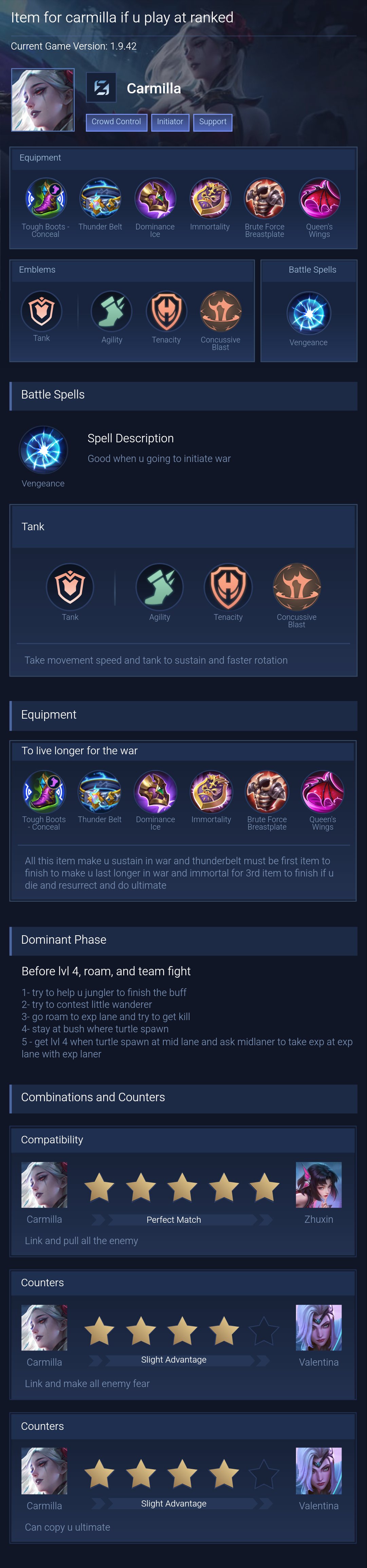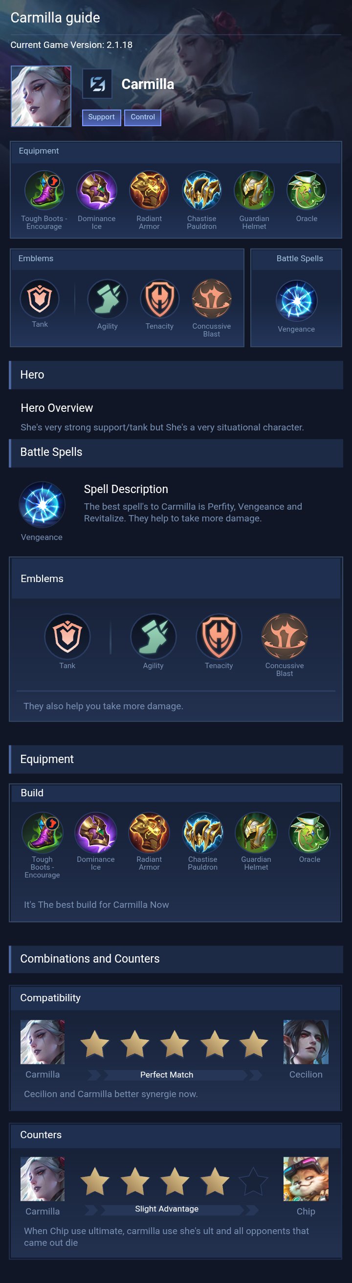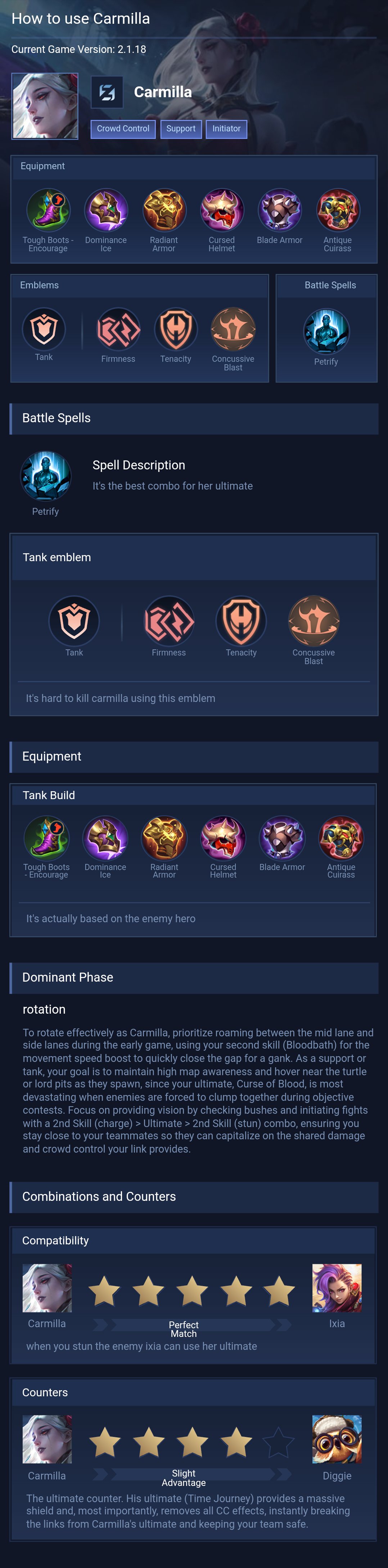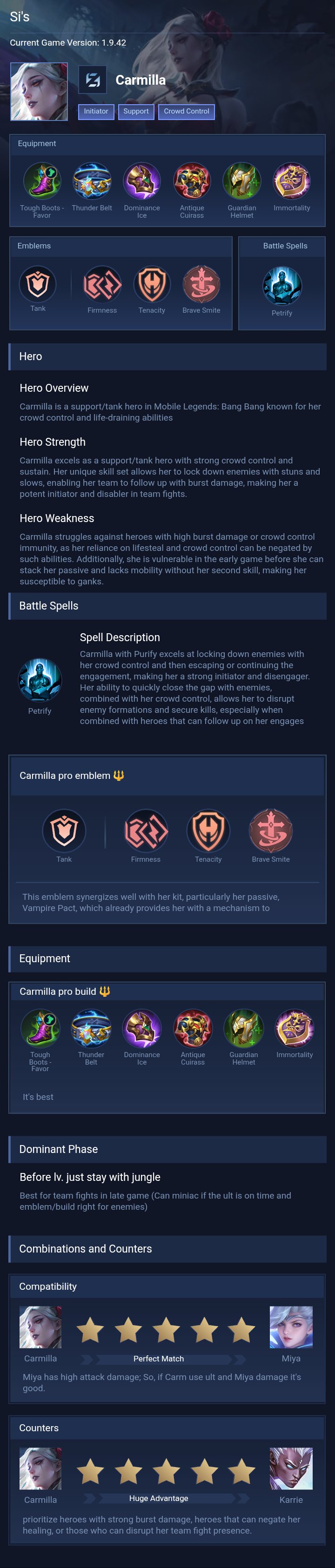 Battle Spell. Carmilla with Purify excels at locking down enemies with her crowd control and then escaping or continuing the engagement, making her a strong initiator and disengager. Her ability to quickly close the gap with enemies, combined with her crowd control, allows her to disrupt enemy formations and secure kills, especially when combined with heroes that can follow up on her engages