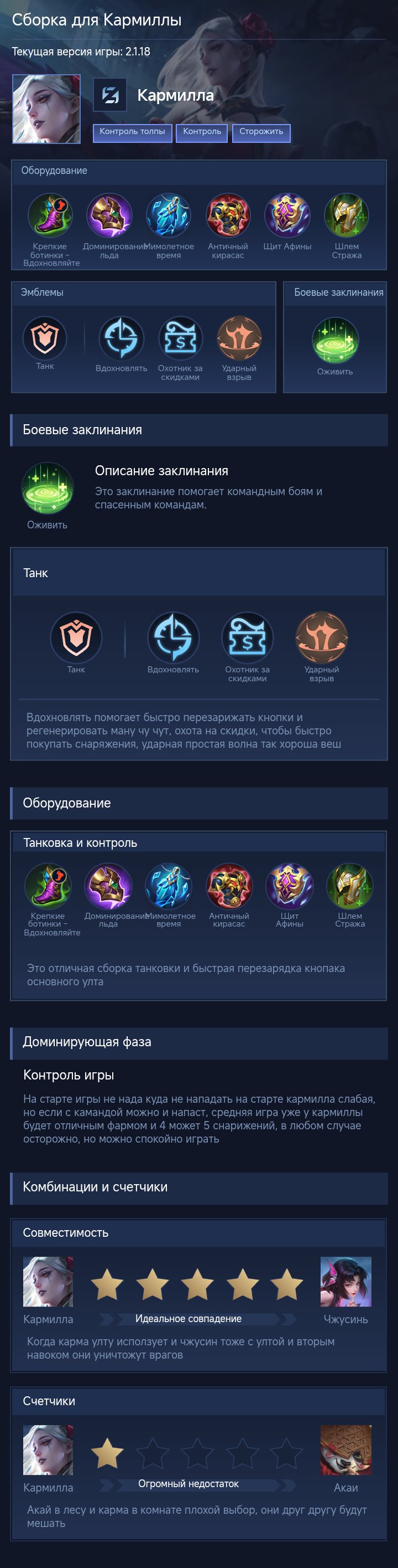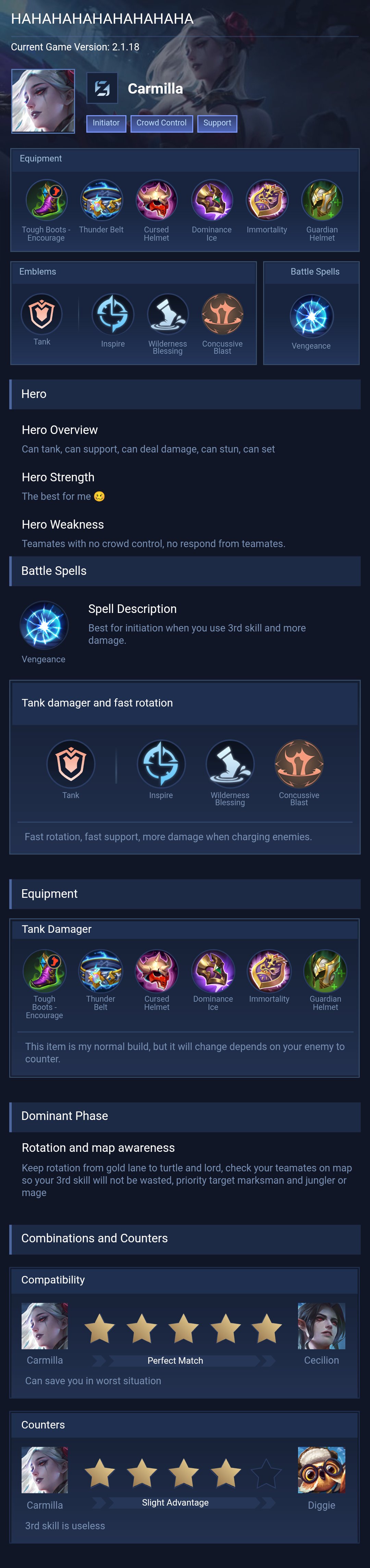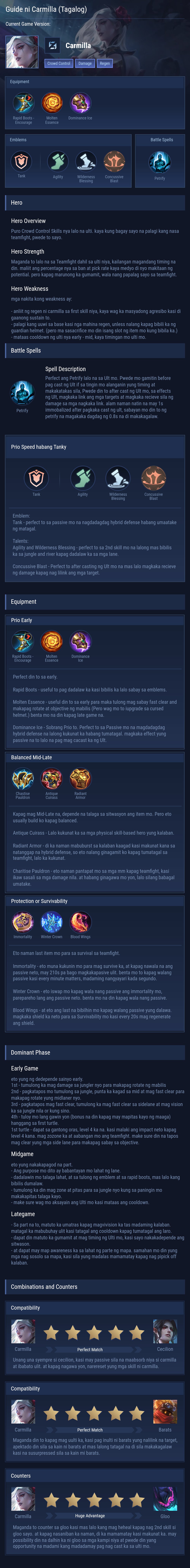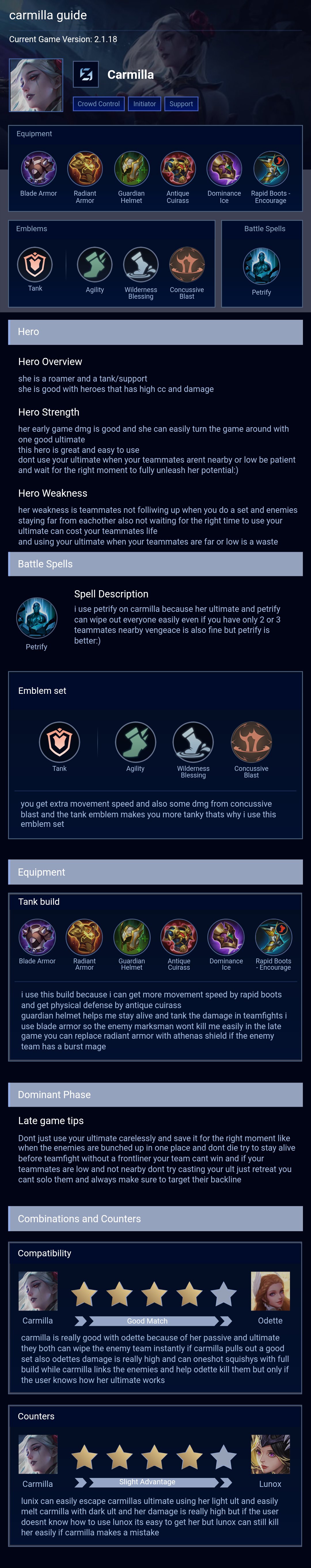 Battle Spell. Carmilla with Purify excels at locking down enemies with her crowd control and then escaping or continuing the engagement, making her a strong initiator and disengager. Her ability to quickly close the gap with enemies, combined with her crowd control, allows her to disrupt enemy formations and secure kills, especially when combined with heroes that can follow up on her engages