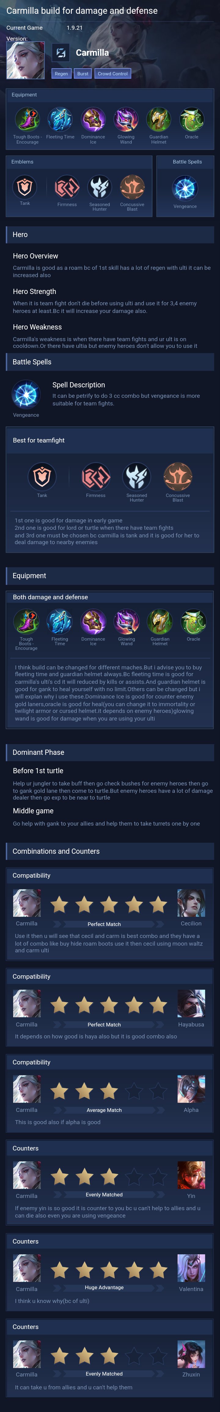 Both damage and defense . I think build can be changed for different maches.But i advise you to buy fleeting time and guardian helmet always.Bc fleeting time is good for carmilla's ulti's cd it will reduced by kills or assists.And guardian helmet is good for gank to heal yourself with no limit.Others can be changed but i will explan why i use these.Dominance Ice is good for counter enemy gold laners,oracle is good for heal(you can change it to immortality or twilight armor or cursed helmet.it depends on enemy heroes)glowing wand is good for damage when you are using your ulti