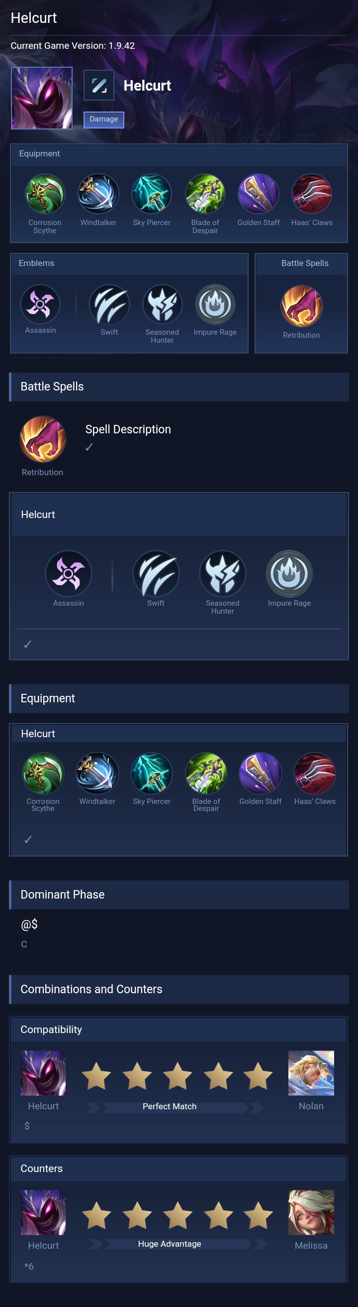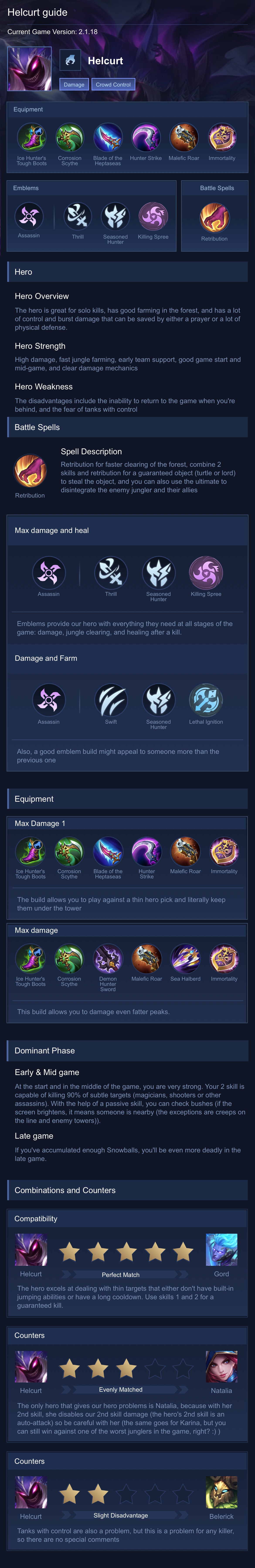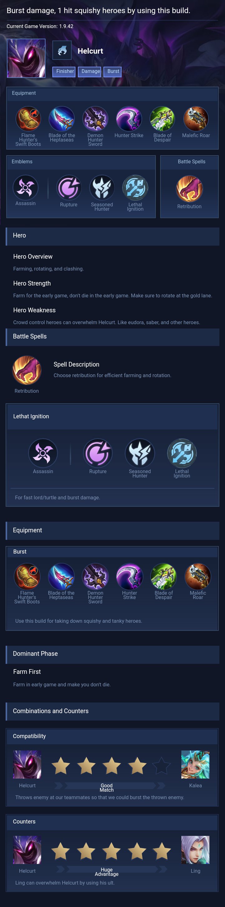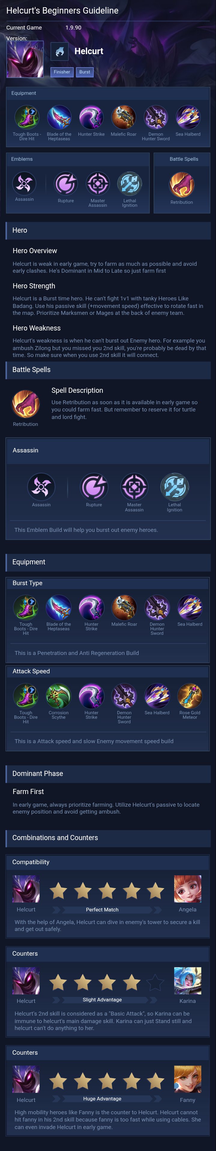Helcurt is a assassin hero with medium difficulty. This is a live guide — win rate, pick rate and counter data refresh every 6 hours from real ranked matches.