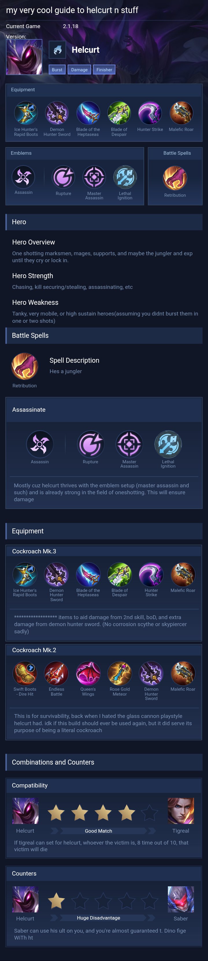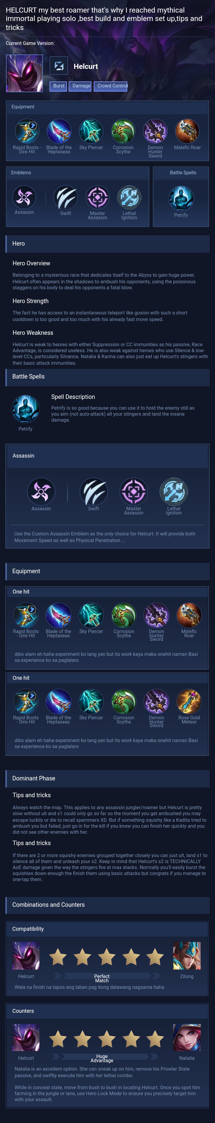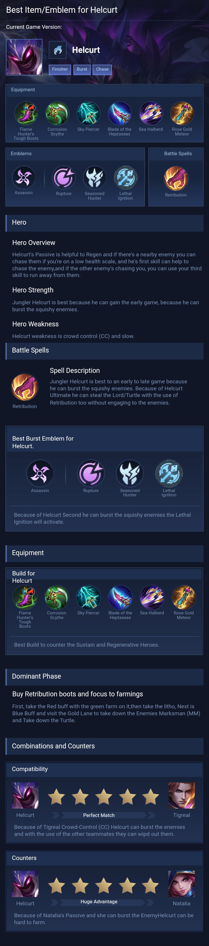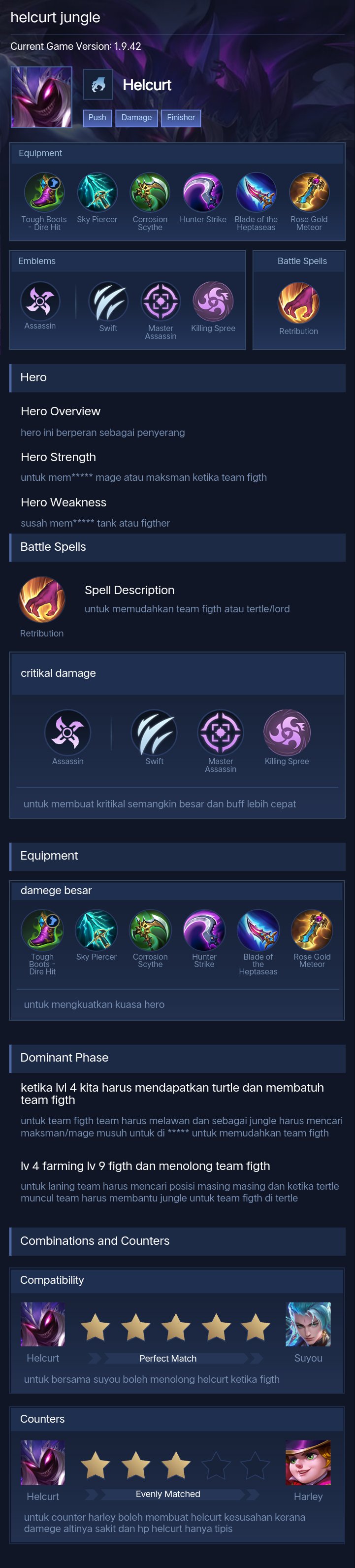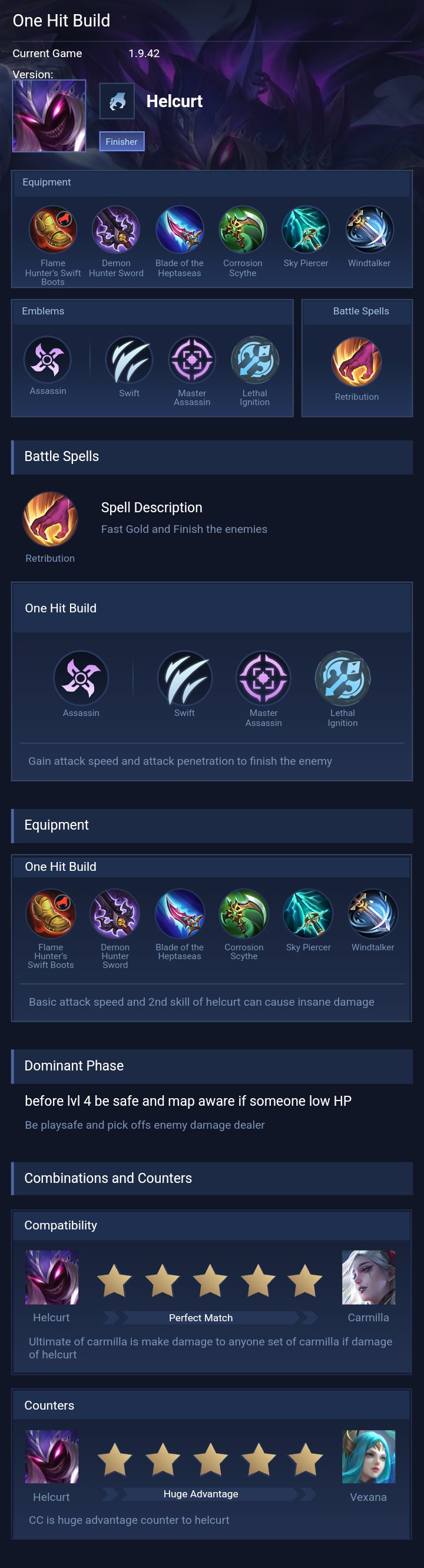 Helcurt is a assassin hero with medium difficulty. This is a live guide — win rate, pick rate and counter data refresh every 6 hours from real ranked matches.