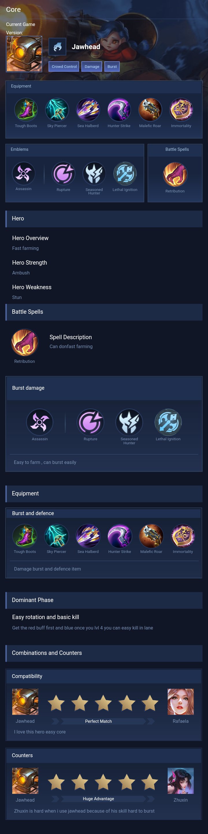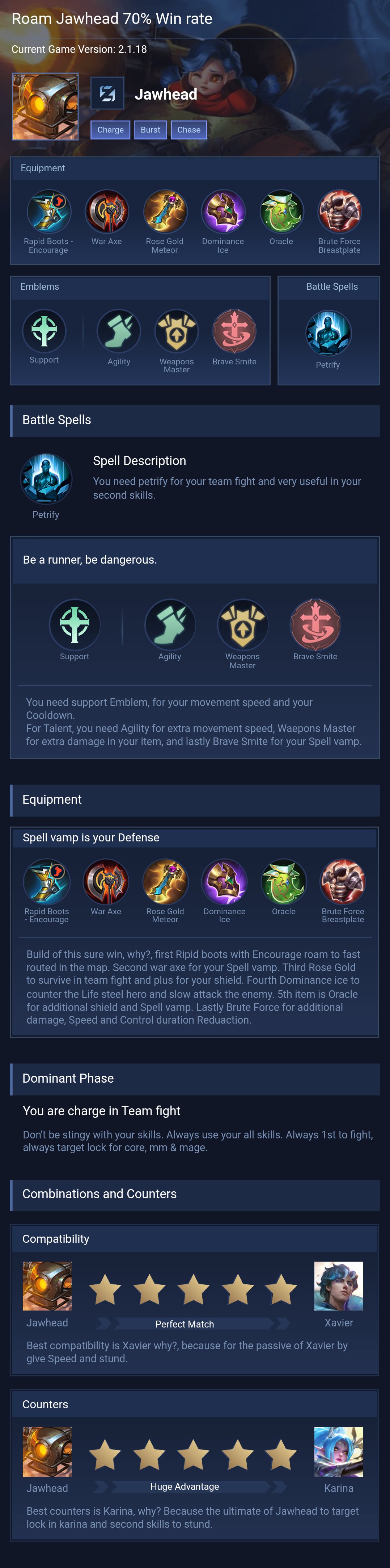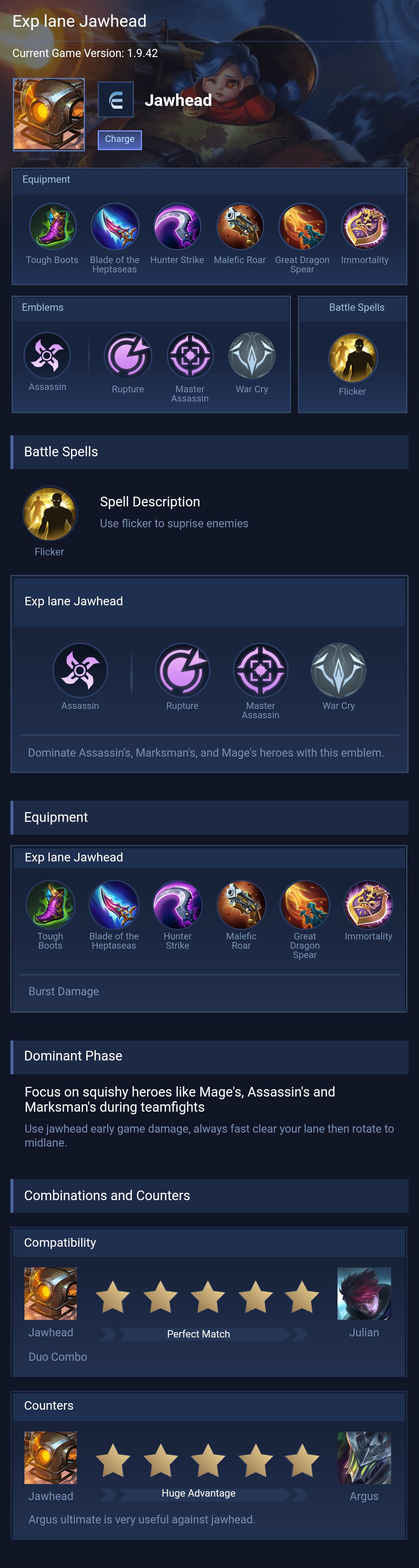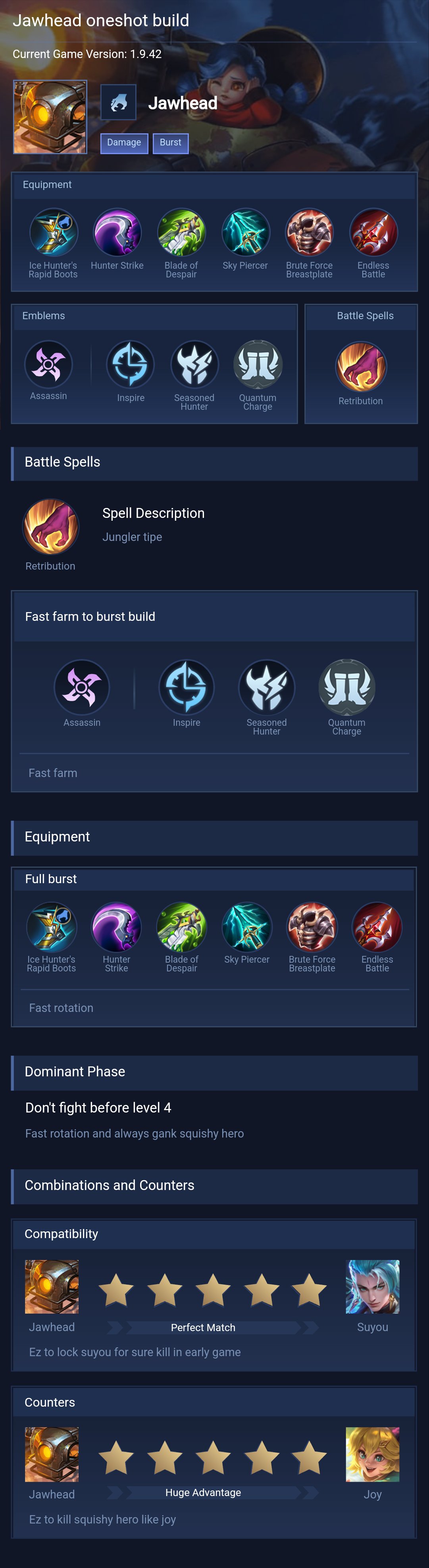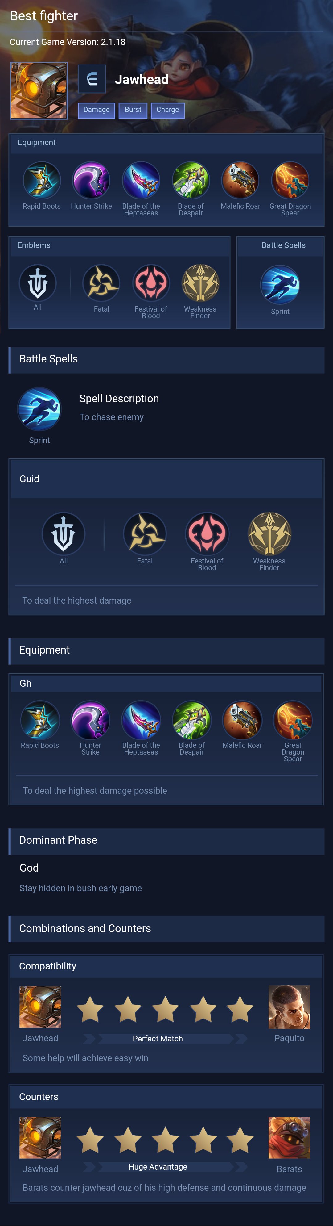 Jawhead is a fighter hero with medium difficulty. This is a live guide — win rate, pick rate and counter data refresh every 6 hours from real ranked matches.