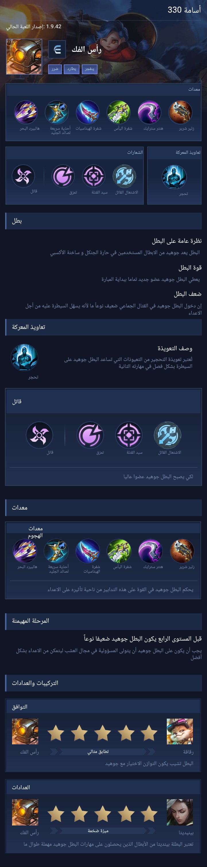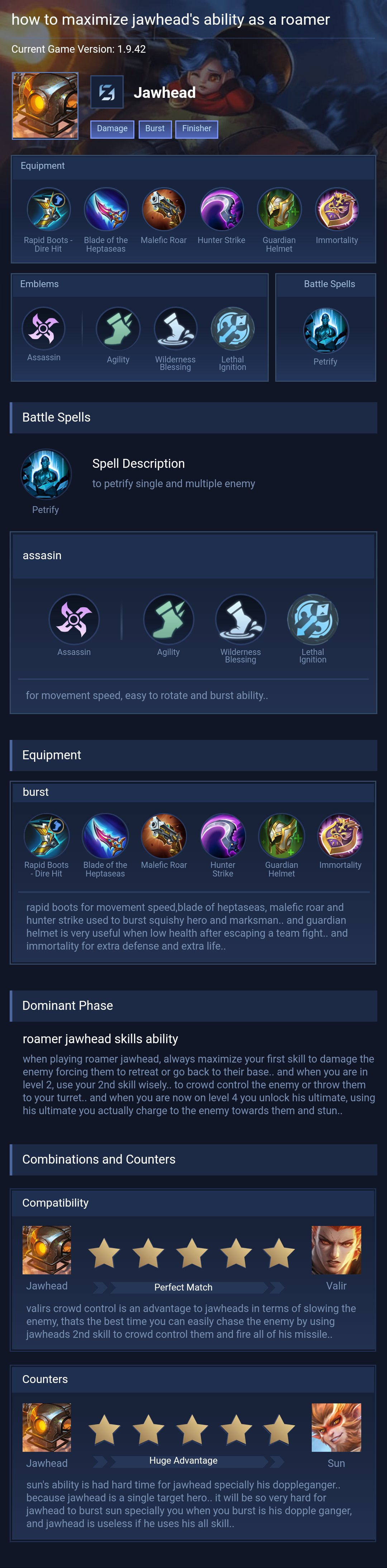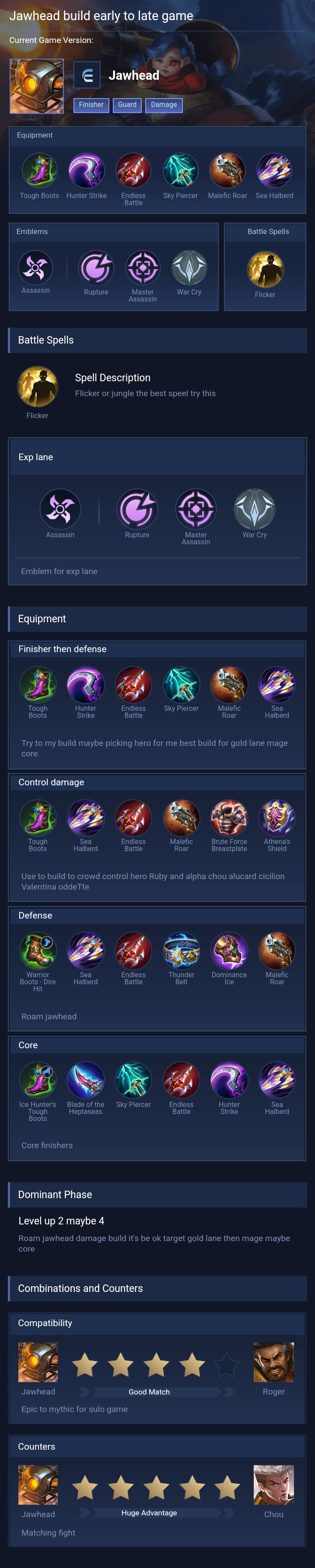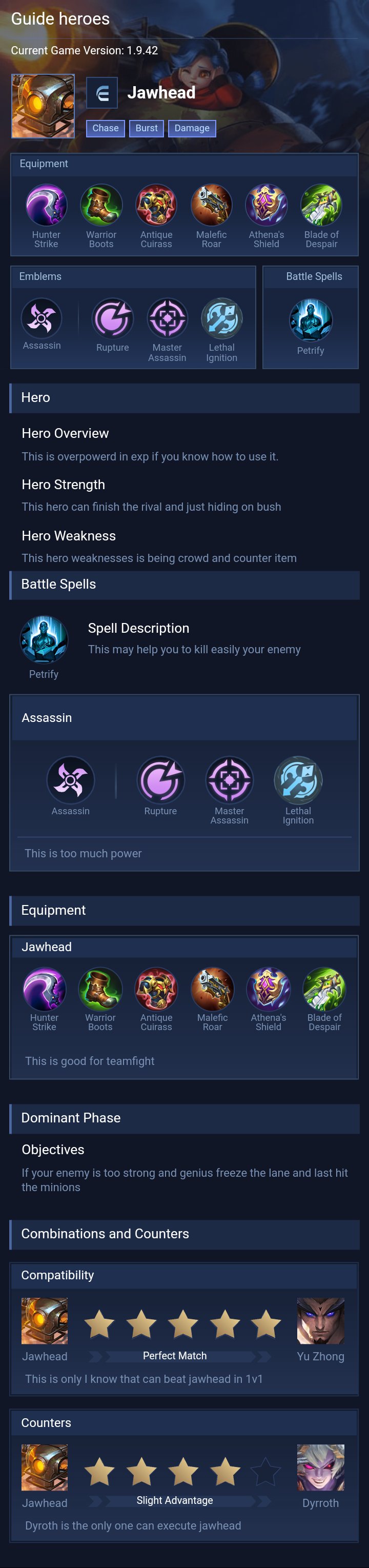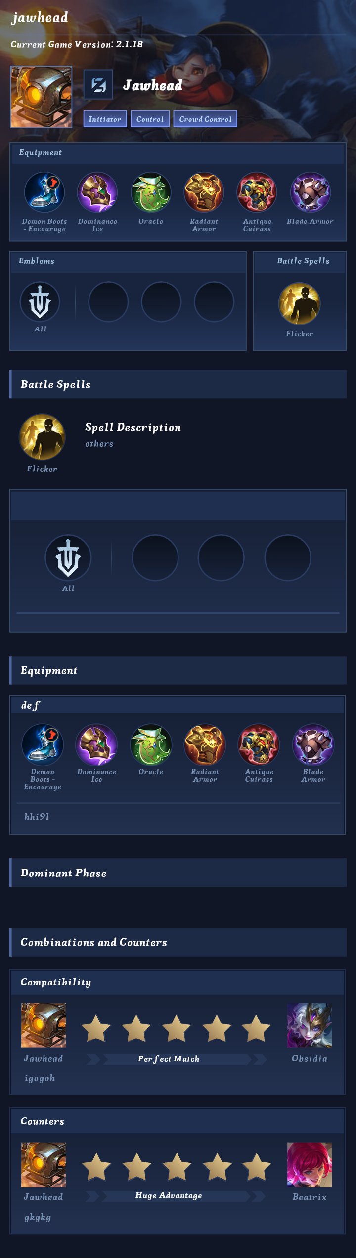 Jawhead is a fighter hero with medium difficulty. This is a live guide — win rate, pick rate and counter data refresh every 6 hours from real ranked matches.
