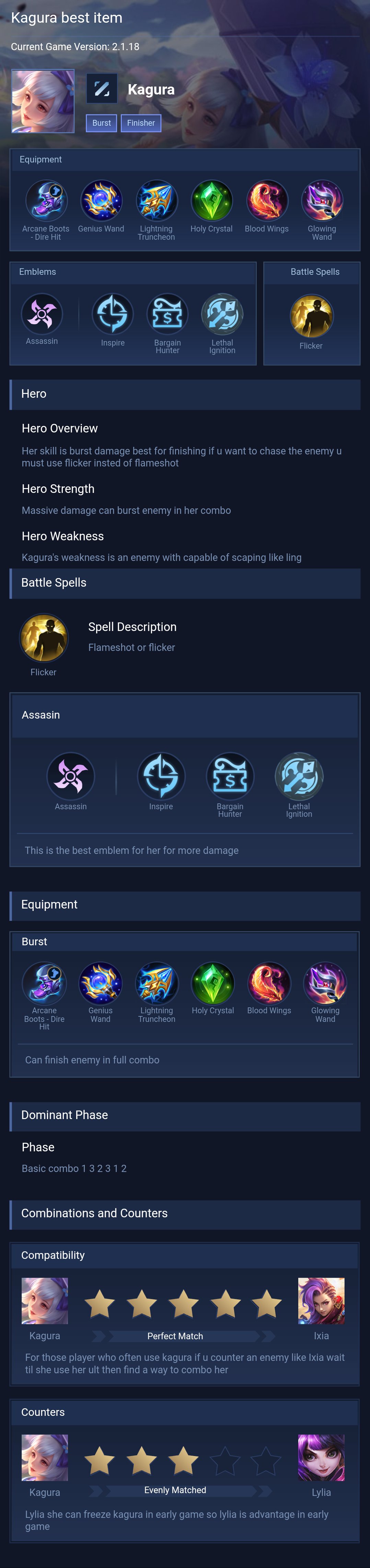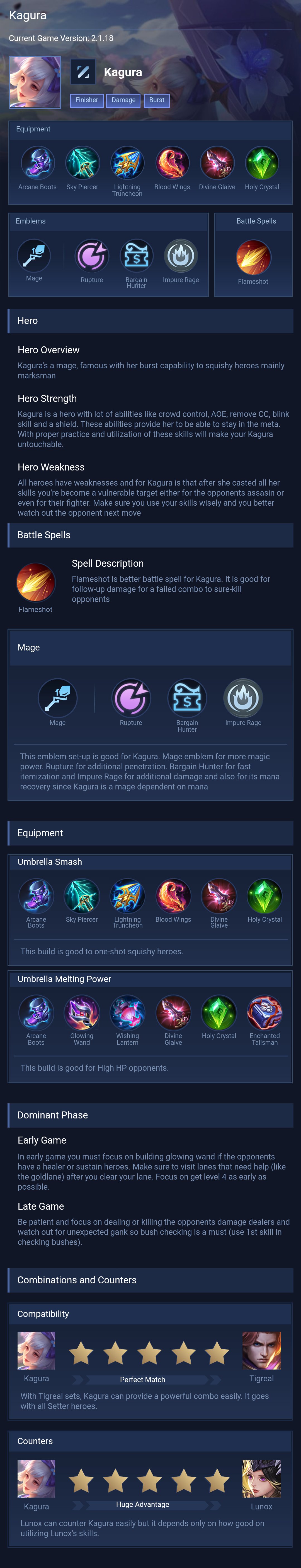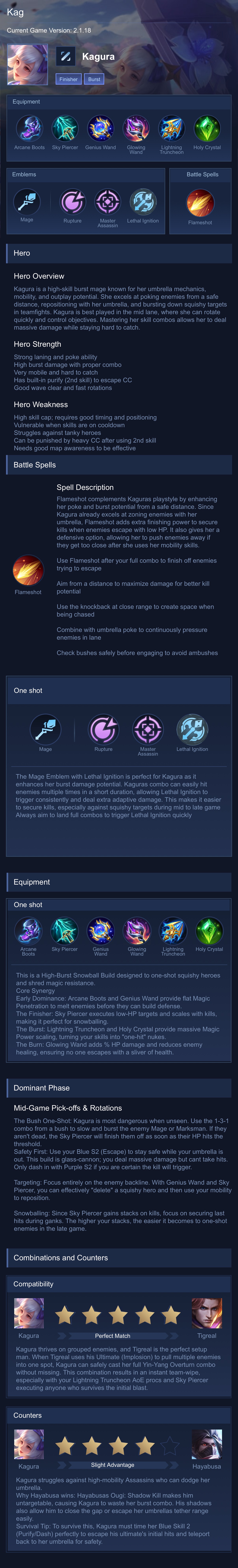 Kagura is a mage hero with hard difficulty. This is a live guide — win rate, pick rate and counter data refresh every 6 hours from real ranked matches.