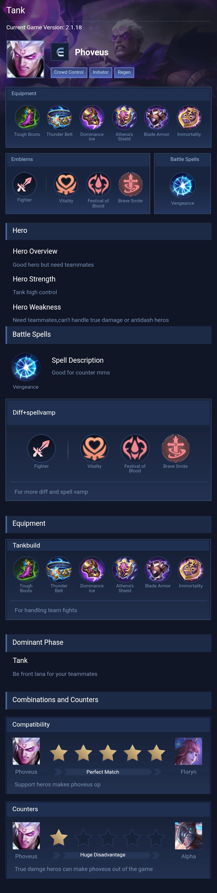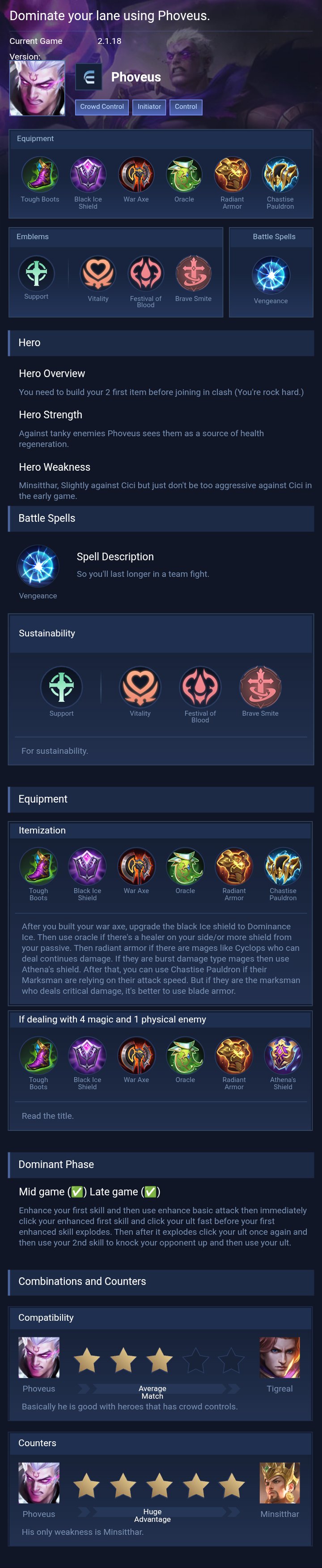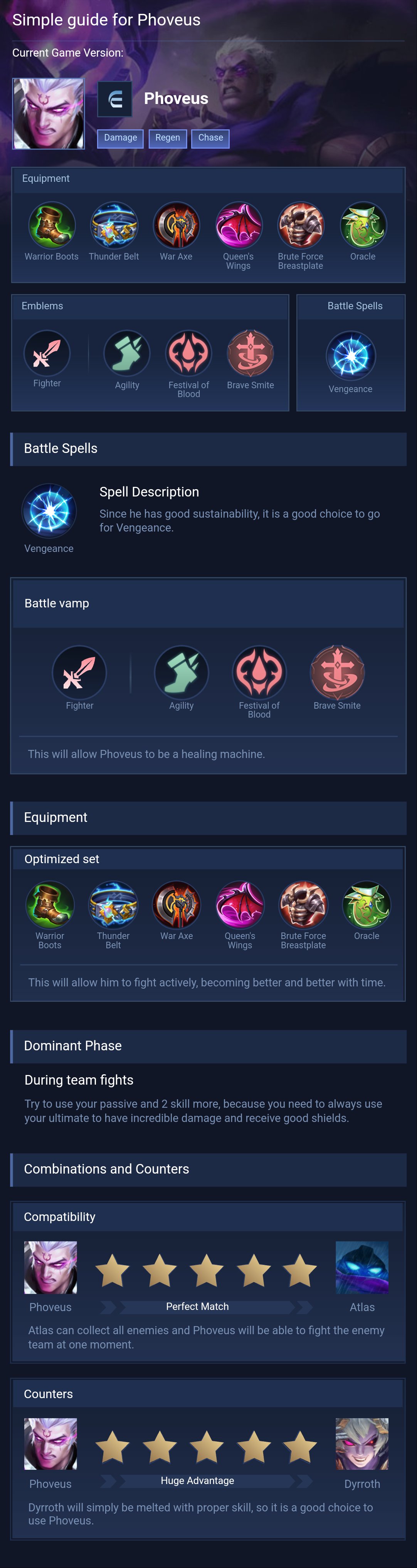 Phoveus is a fighter hero with medium difficulty. This is a live guide — win rate, pick rate and counter data refresh every 6 hours from real ranked matches.