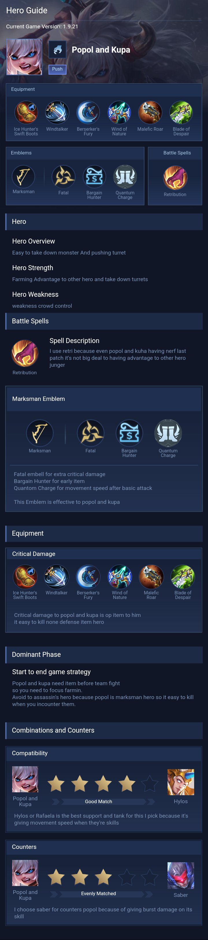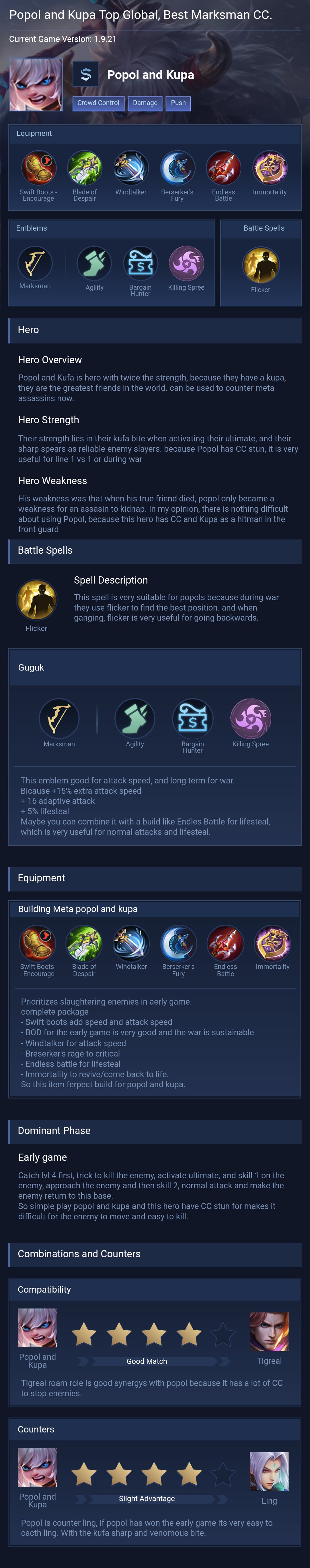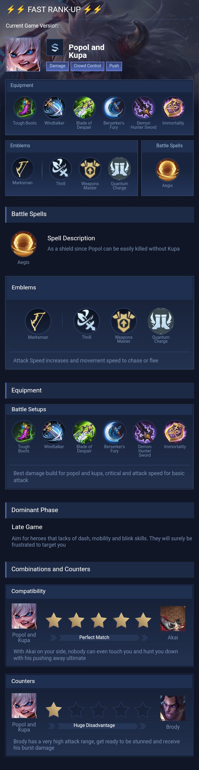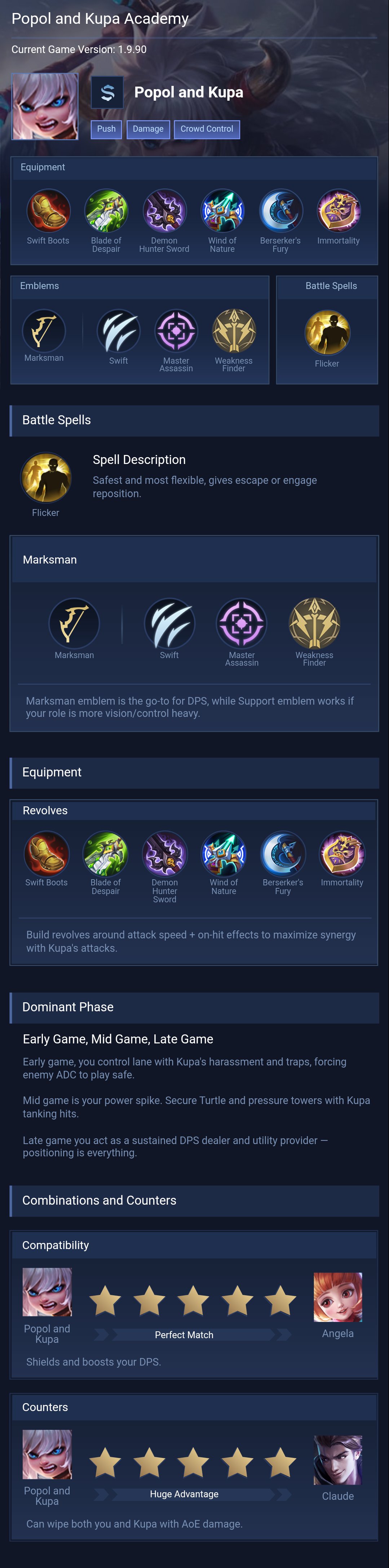 Every 3 consecutive attacks from Kupa will enhance Popol's next Basic Attack to deal (+220% Total Physical Attack) Physical Damage. Kupa has 2500 (+1200% Total Physical Attack) Max HP and inherits 100% of Popol's other attributes and passive equipment effects (excluding Jungling and Roaming equipment effects).