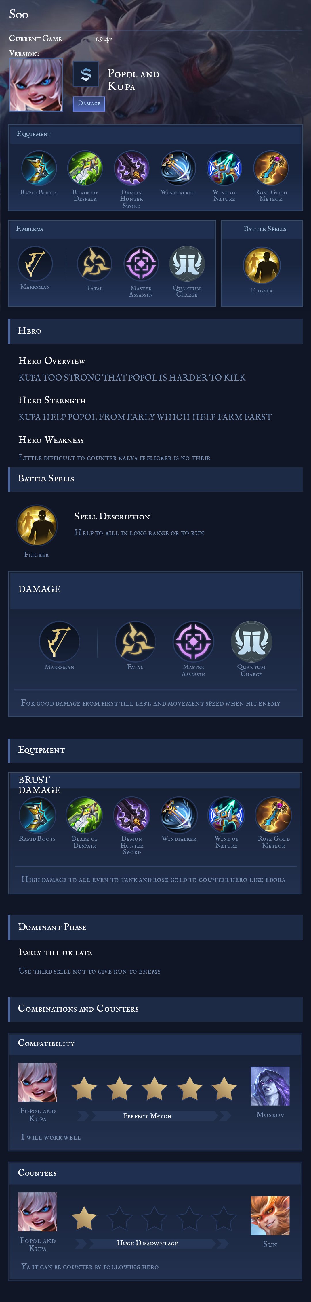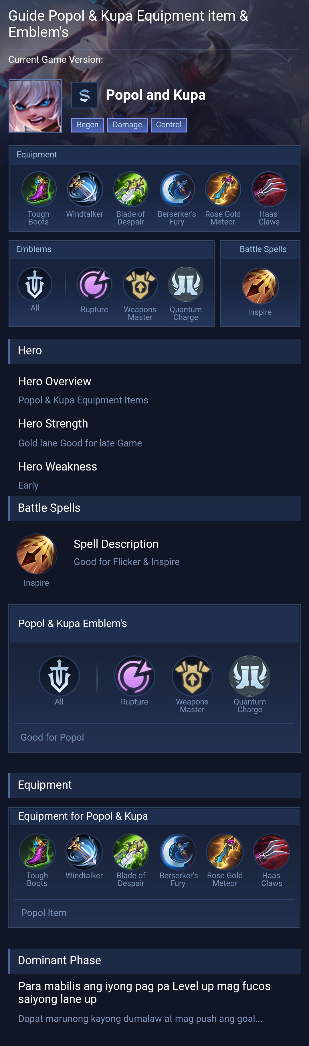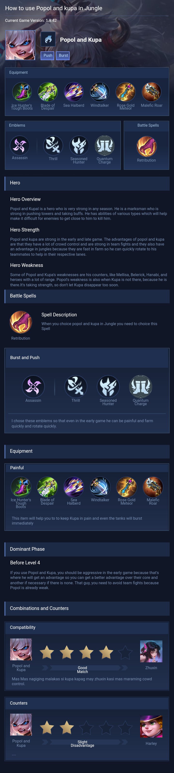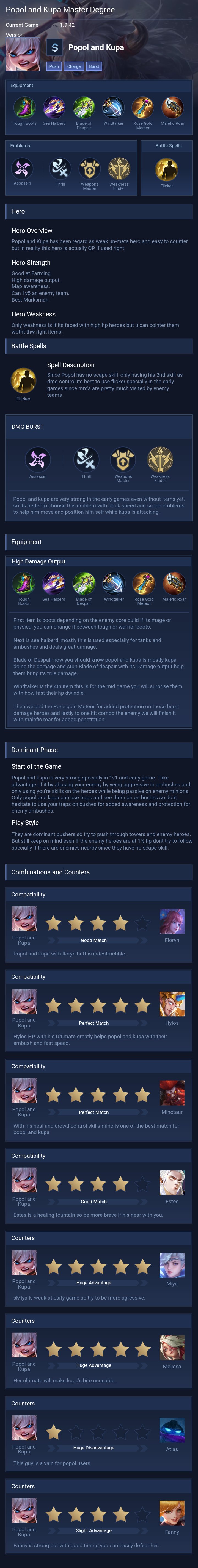 Every 3 consecutive attacks from Kupa will enhance Popol's next Basic Attack to deal (+220% Total Physical Attack) Physical Damage. Kupa has 2500 (+1200% Total Physical Attack) Max HP and inherits 100% of Popol's other attributes and passive equipment effects (excluding Jungling and Roaming equipment effects).