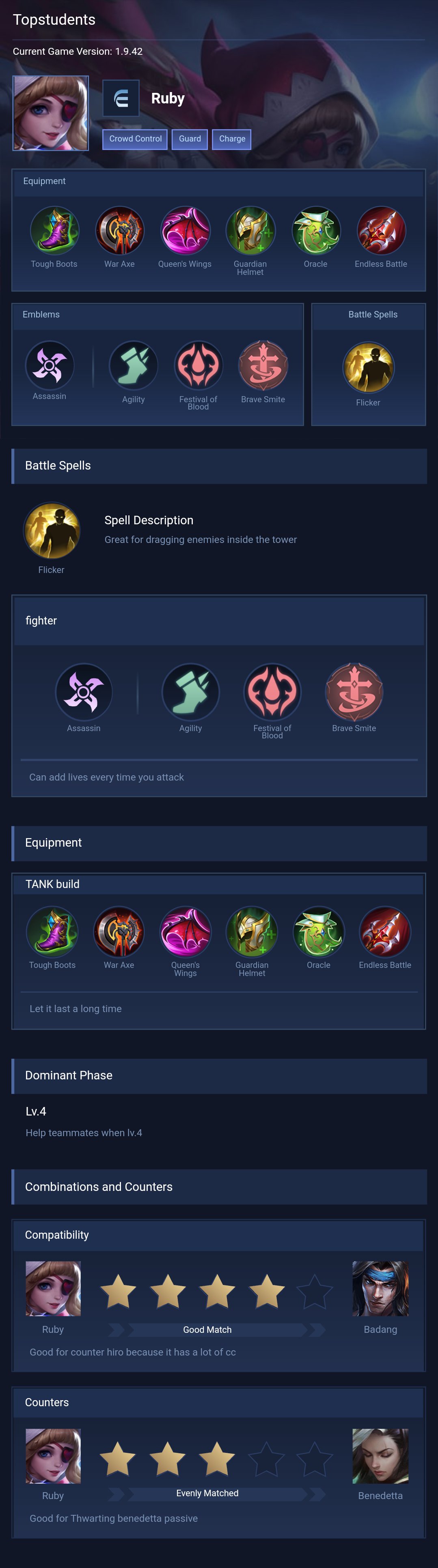 Using these emblem setup will benefit your Ruby in your laning stage early game till late. You need to focus on last hitting the minions for faster gold and use enemies minions to gain life back when low on health. When going against your counterpart always consider play passive diring early and mid stage,till u get your two core items before you can floor your enemies and assists your allies in team fights. Having these emblem setup also helps with tankiness in your laning phase.