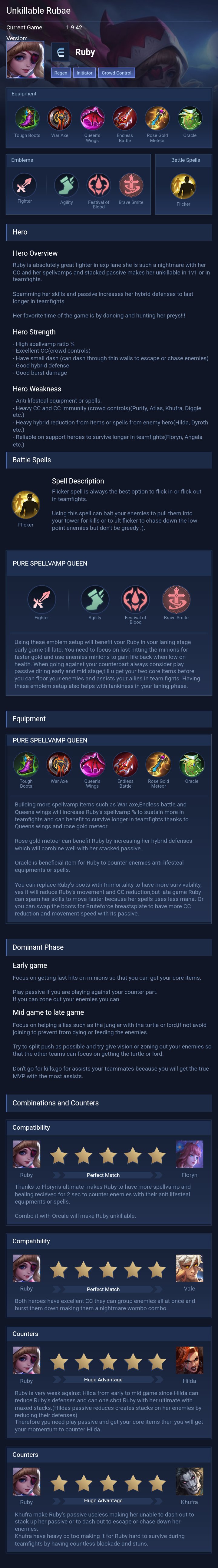 PURE SPELLVAMP QUEEN. Building more spellvamp items such as War axe,Endless battle and Queens wings will increase Ruby's spellvamp % to sustain more in teamfights and can benefit to survive longer in teamfights thanks to Queens wings and rose gold meteor.